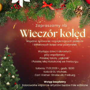 Spotkajmy się w sobotę 17 stycznia 2026 r. o godz. 18:00 w kościele St. Michael we Freiburgu. Przyjdź z rodziną i przyjaciółmi – spędźmy ten wieczór razem w świątecznej atmosferze.